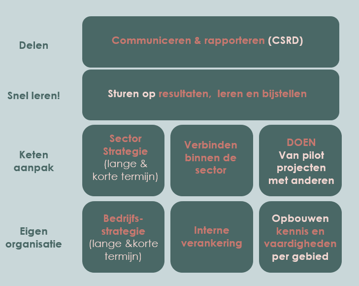 We will gather information from your own organisation and the market, and through a number of interviews we will find out where you stand and what has been done in recent years. The insights will be presented in a concluding presentation, after which you can immediately make choices in the building blocks of your sustainable course.